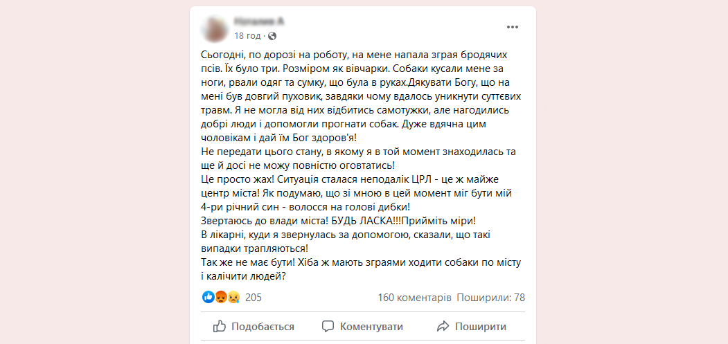 «Не передати цього стану, в якому я в той момент перебувала, та ще й досі не можу повністю оговтатись! Це просто жах! Ситуація сталася неподалік ЗБЛ – це ж майже центр міста! Як подумаю, що зі мною в цей момент міг бути мій чотирирічний син – волосся на голові дибки!» – пише пані Наталія.