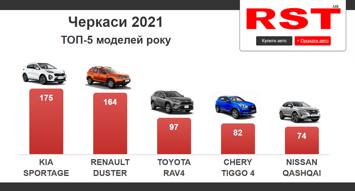 Renault стало найпопулярнішим брендом. У регіоні минулого року придбали 345 таких автомобілів. Лідером серед моделей став корейський кросовер Kia Sportage, який покрив 7,5% ринку. Крім нього часто реєстрували Renault Duster і Toyota RAV4.