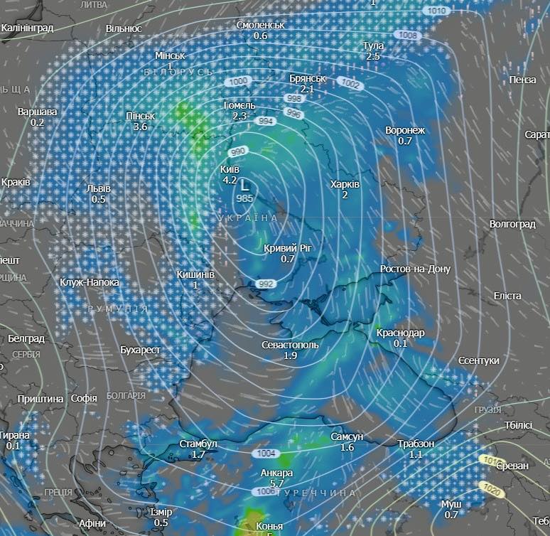 Циклон сформувався за умов значного контрасту повітряних мас: у тиловій частині панує арктичний холод, тоді як у теплому секторі надходить тропічне повітря із Середземномор’я. Саме таке поєднання зумовлює небезпечну й різноманітну погоду на території України.