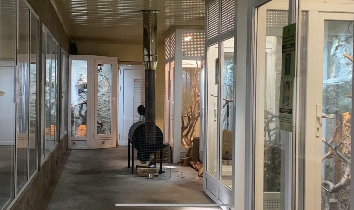 У тераріумі встановлені пічки на твердому паливі: фонова температура тут - 26–28 градусів. Вона критично важлива для змій, ящірок, черепах, крокодилів, варанів. Для них переохолодження смертельно небезпечне - порушуються всі процеси, зокрема травлення.