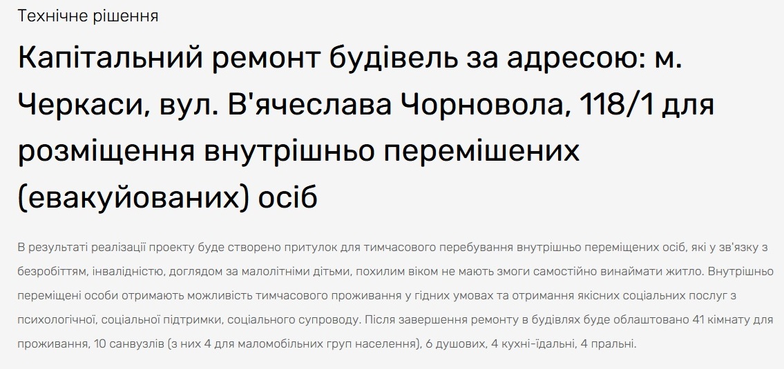 У Черкасах відкрили новий тимчасовий притулок для внутрішньо переміщених осіб. Це колишній садок, який занепадав — тепер тут облаштовані кімнати для проживання переселенців. Проєкт реалізовано завдяки співпраці Європейського інвестиційного банку та Черкаської міської ради. Загальна вартість — майже 96 млн грн: 80% профінансував ЄІБ, решту — бюджет Черкаської міської територіальної громади.