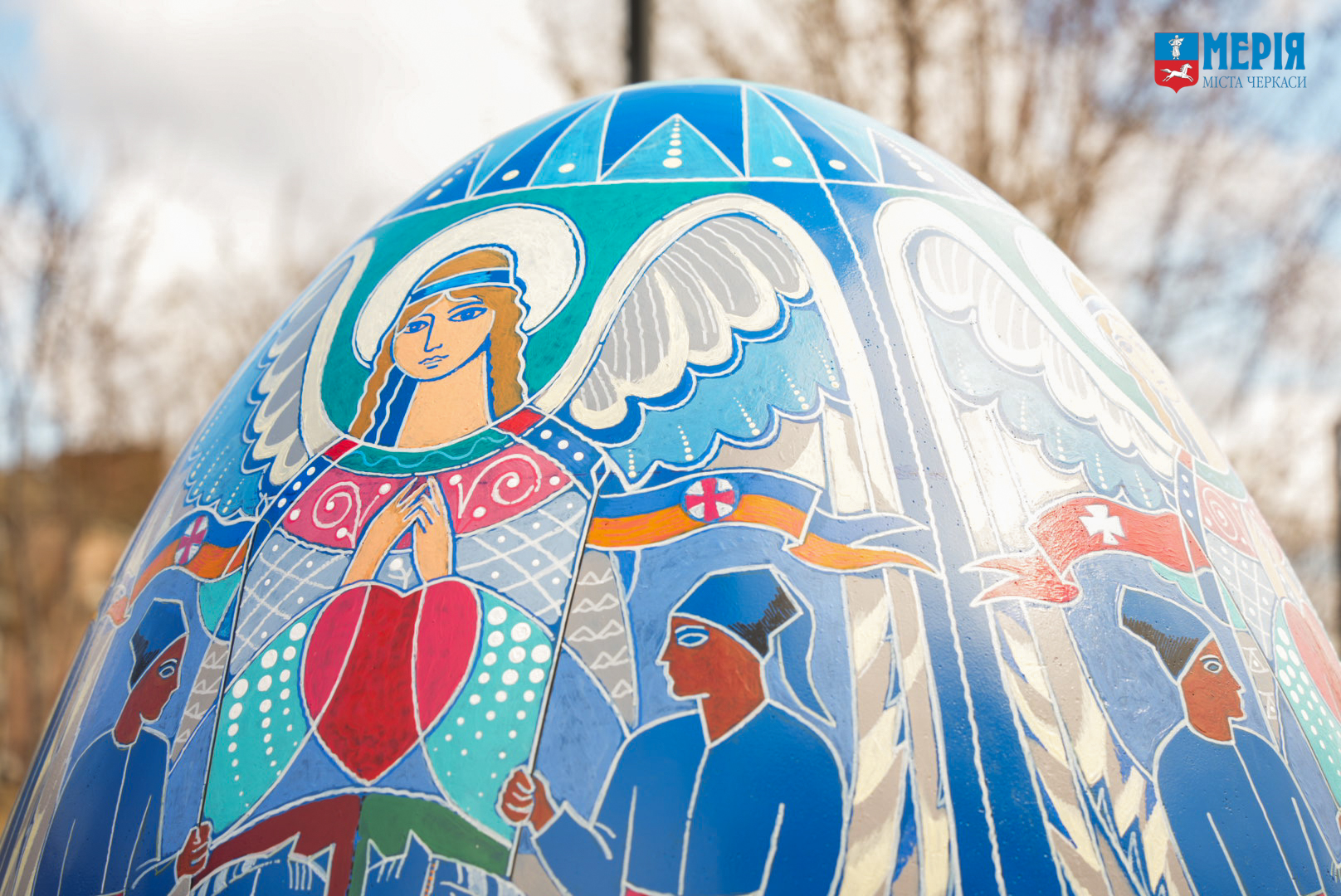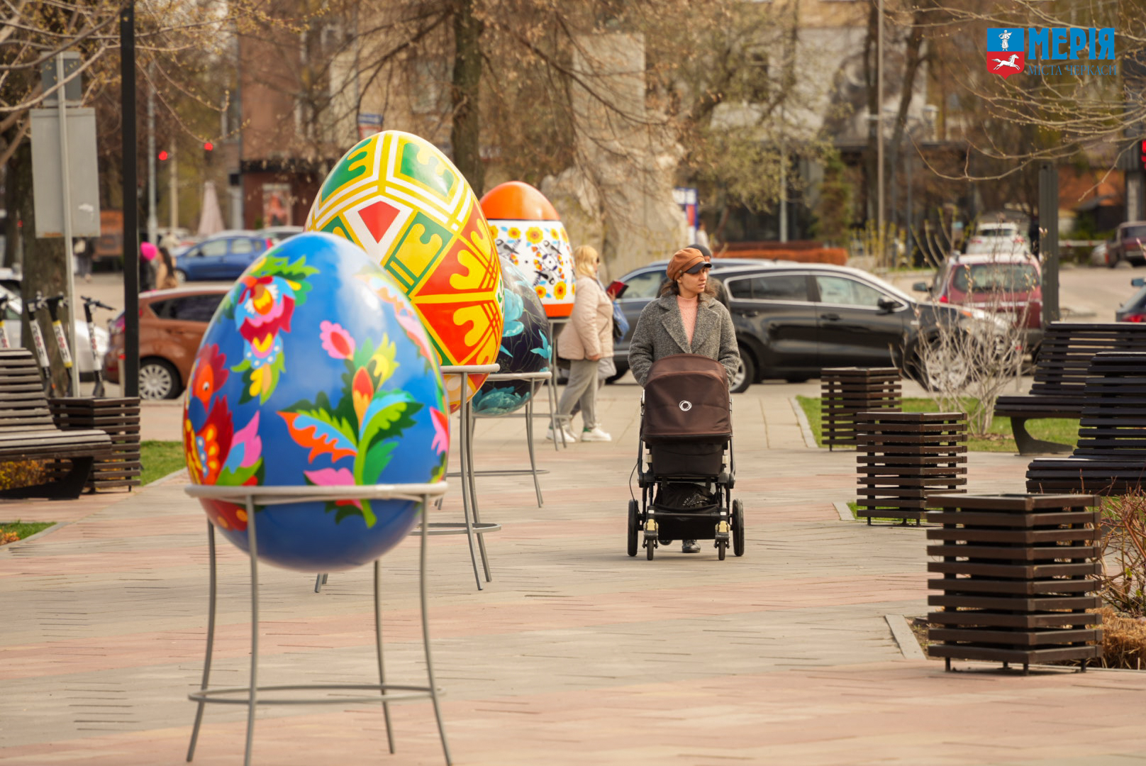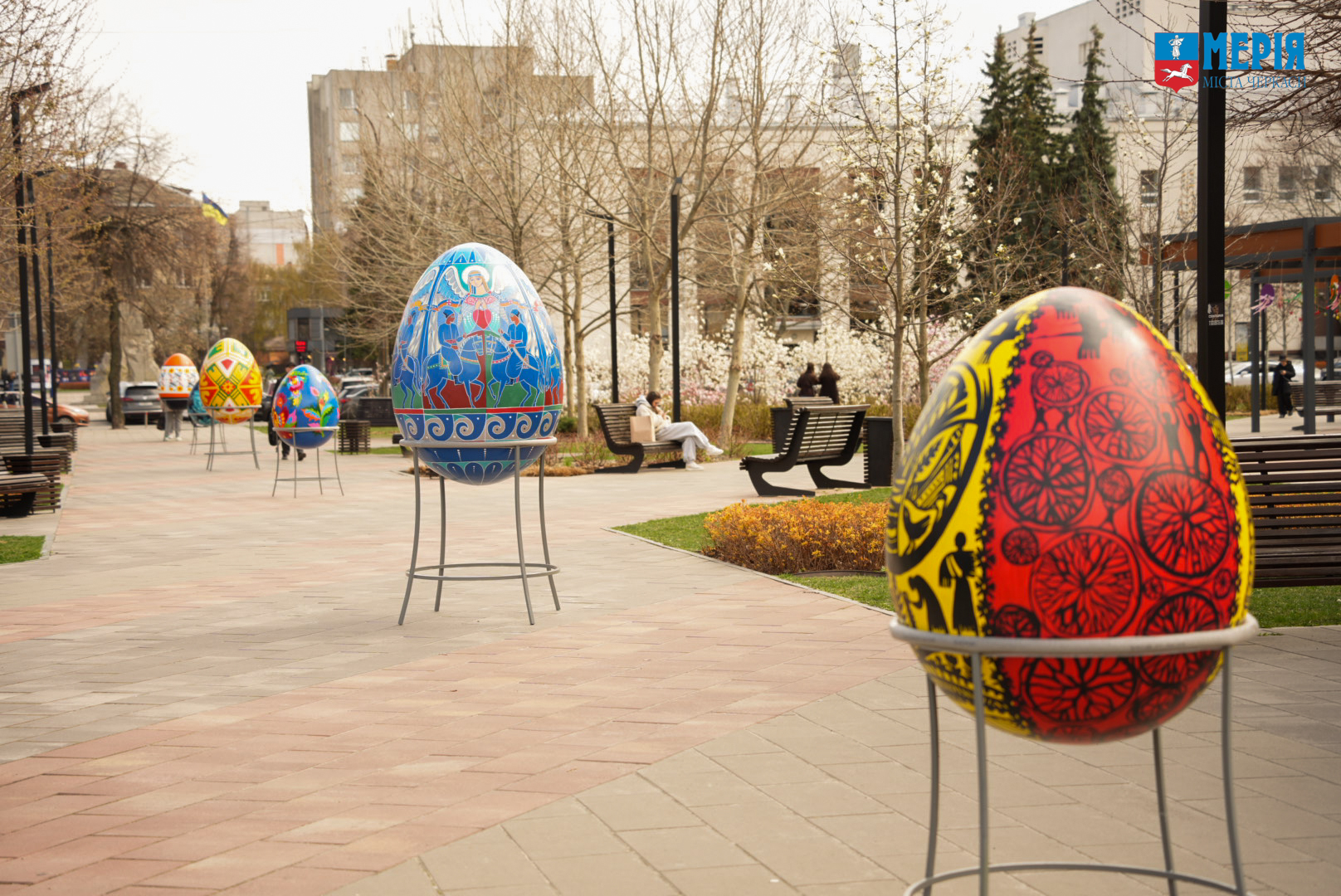 Також у сквері встановили великі писанки, розписані вихованцями мистецьких шкіл, студентами черкаських вишів та майстрами народного мистецтва України.